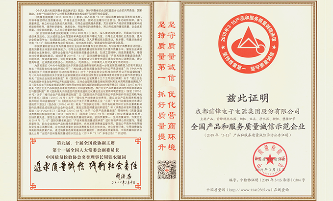 從中國(guó)質(zhì)量檢驗(yàn)協(xié)會(huì)傳來(lái)喜訊,成都前鋒電子電器有限股份公司榮獲“全國(guó)產(chǎn)品和服務(wù)質(zhì)量誠(chéng)信示范企業(yè)”榮譽(yù)稱號(hào)。