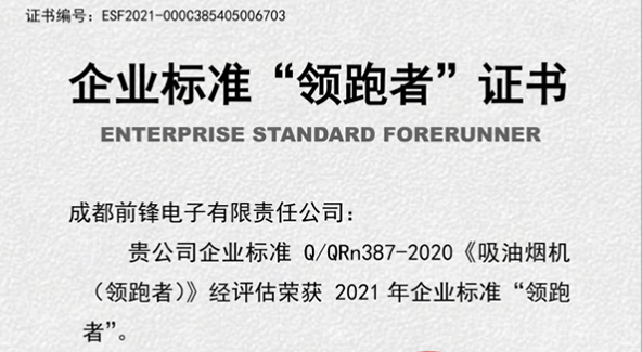 近日,由中國標準化研究院主辦的《2021年全國企業標準領跑者榜單》發布。成都前鋒電子有限責任公司生產的前鋒牌吸油煙機CXW-200-L803 榮獲企業標準《吸油煙機(領跑者)》殊榮。