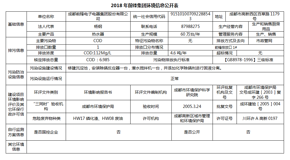 2018年前鋒集團環境信息公開表